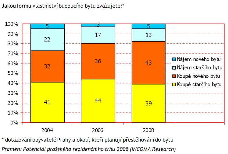 V průměru každá osmá domácnost z Prahy a přilehlého okolí plánuje stěhování v horizontu následujících tří let, přičemž 6 % je ke stěhování již pevně rozhodnuto a 6 % o tom uvažuje. Ve srovnání s minulostí to představuje značný nárůst vůle pražské populace k mobilitě. Navíc další téměř 4 % obyvatel Prahy zvažují nákup nemovitosti jako formu investice. Potvrdil to rozsáhlý reprezentativní průzkum „Potenciál pražského rezidenčního trhu 2008“, který v Praze a jejím okolí uskutečnila společnost INCOMA Research. Takřka dvě třetiny respondentů, přesně 61 % cílových domácností uvažuje o stěhování do bytu, 39 % do rodinného domu. V případě plánovaného stěhování do bytu zásadně převažuje zájem o koupi bytu nad zájmem o nájemní bydlení (82:18). Za poslední dva roky také výrazně vzrostl zájem o nákup nového bytu (z 36 % na 43 % domácností). Pronájmy preferují zejména chudší, starší a personálně „menší“ domácnosti.