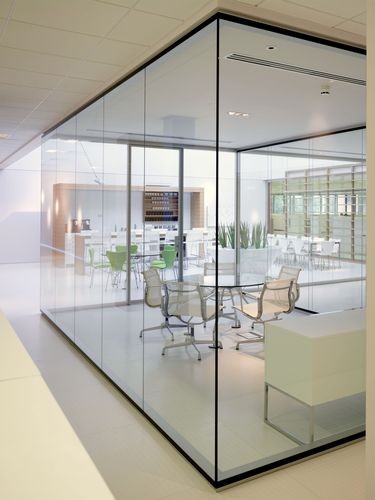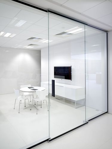 Pre členenie jednotlivých kancelárií a konferenčných miestností spoločnosť Spink Property stavila na chodbové steny RF od firmy Bene. Tento elegantný priestorový systém umožňuje na jednej strane rozdelenie miestnosti na získanie rôznych funkcií kancelárskeho priestoru a súčasne používateľovi umožňuje túlať sa očami po celom poschodí. Sklené elementy zabezpečujú možnosť nerušene nazerať do kancelárií a štúdia. Skutočná kvalita systému Bene RF – jasné a pokojné plochy – sa prejavuje vo svojej dokonalosti až vtedy, keď je systém nainštalovaný. Upevnenie sklených elementov len na strope a dlážke (bez vertikálnych spojovacích prvkov) umožňuje optickú kontinuitu sklených stien. Dvojvrstvové prevedenie elementov zabezpečuje akustickú izoláciu. Počas konferencie možno vidieť jej účastníkov – sediacich na hliníkových stoličkách s bielou sieťkou okolo okrúhlych sklených stolov od firmy Foster –, ale von sa nedostane žiadny zvuk. To vytvára pokojnú, avšak dynamickú pracovnú atmosféru.