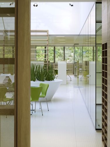 Stôl na recepcii patrí k priestorom kaviarne a oddychovej zóny. Občerstvenie sa ponúka v individuálne vytvorenom priestore, ktorý je vybavený veľkým bielym pultom a vhodnými stoličkami od firmy Wilkhahn. Dva sklené stoly od B&B Italia dodávajú skutočnú atmosféru jedálne. Harmonický kontrast vytvárajú stoličky lakované na bielo z legendárnej série 7 od Fritz Hansen. Pri malom okrúhlom stole stoja rovnaké stoličky s čalúnením v sviežej jablkovej zelenej farbe. Podobné stoličky, ktoré sú príjemným farebným doplnkom k bielym plochám, sa nachádzajú aj vo všetkých kanceláriách a konferenčných miestnostiach budovy. Obrovský kvetináč s trávami v átriu obohacuje priestor o prirodzenú zeleň.
