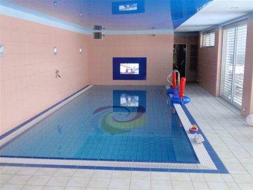 Prvému nadzemnému podlažiu dominuje spoločenská časť domu spolu s kuchyňou. Tiež tu nájdeme už spomínaný bazén s LCD televízorom, parnú a suchú saunu. Dodávateľom bazénových zariadení a dvoch druhov sáun je spoločnosť B.P.A., ktorá je zároveň dodávateľom zariadenia na čistenie a chemickú úpravu bazénovej vody. Všetky vodné technológie sa dajú ovládať z nadriadeného inteligentného systému Crestron.