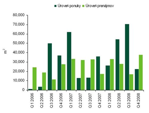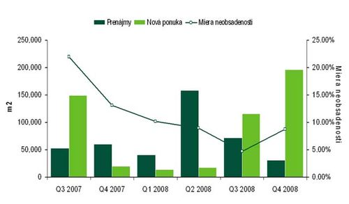 Minulý rok bol zo strany dopytu po moderných kancelárskych priestoroch enormne silný – uskutočnilo sa dokopy 37 transakcií a tento rok sa očakáva nárast ich celkovej výmery o ďalších 160-tisíc m2. Záujem vo štvrtom kvartáli sa zvýšil o 37 752 m2, čím celkový objem kancelárskych priestorov prenajatých v roku 2008 dosiahol hodnotu porovnateľnú s rokom predošlým – 116 000 m2. Miera ich neobsadenosti vzrástla v Bratislave z 8,3 na 8,9 percenta, pričom najvyššiu hodnotu dosiahla v širšom centre Bratislavy (10,4%). Situácia s cenami za mesačný prenájom sa zásadne nezmenila: v samom centre sa pohybuje okolo 18, v širšom centre v rozpätí 10–14 a mimo centra 8–12 eur.