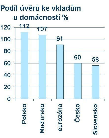 Úspory domácností u českých bank pokračují v raketovém růstu. Vklady domácností ke konci února meziročně vzrostly o 12,5 % a dosáhly podle statistik ČNB rekordních 1, 554 bilionu korun. Podobný vývoj můžeme sledovat jak v eurozóně, kde růst vkladů domácností přesahuje 10 %, tak u našich sousedů v Polsku a v Maďarsku. Je to důsledek vyšší opatrnosti domácností, které mají v době hospodářské krize strach zejména ze ztráty zaměstnání. Domácnostem jdou naproti i banky, které se v době krize snaží snižovat poměr objemu poskytnutých úvěrů vůči vkladům. Tato snaha je patrná i v českém prostředí, a to nehledě na dobrou kondici českého finančního systému, kde mají všechny velké banky výrazně víc vkladů než úvěrů – projevuje se v ochotě platit klientům za vklady o poznání lepší ceny než v minulých letech. I když kumulace úspor akceleruje prakticky ve všech zemích napříč Evropou, výchozí podmínky jsou diametrálně rozdílné. České domácnosti na rozdíl od většiny svých evropských sousedů byly v dobrých časech daleko konzervativnější. Podíl úvěrů, které si nabraly od bank vůči vkladům, které jim leží na bankovních účtech, činí pouhých 60 %. Jsou tak v porovnání s domácnostmi ve svém okolí v pozici výrazného čistého věřitele (viz graf). Ten i díky nim disponuje solidními přebytky úspor a netrpí předlužeností jako sousední Maďarsko nebo některé ekonomiky v Pobaltí.