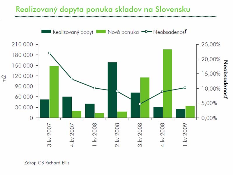 Prieskumy poradenských spoločností poukazujú na to, že hoci začiatok roka 2009 vyzeral z pohľadu mnohých makroekonomických či realitných ukazovateľov sľubne, týkalo sa to len štatistiky oproti rovnakému obdobiu rokov 2008 alebo 2007. Moment zotrvačnosti navodený razantnosťou predchádzajúceho hospodárskeho rastu však pomaly, ale isto ochabuje a pri medzimesačnom a medzikvartálnom porovnaní už vystupujú do popredia prvé markantnejšie dôsledky vytrvalého pôsobenia globálnej krízy v lokálnych podmienkach. Spoločnosť CB Richard Ellis to v poslednom vydaní BIG BOX – pravidelného reportu o trhu s priemyselnými, logistickými a skladovými nehnuteľnosťami potvrdzuje. Výsledky za prvý štvrťrok 2009 hovoria: celkový objem prenájmov logistických priestorov dosiahol 25 176 m2, čo znamená medzikvartálny pokles realizovaného dopytu o 19 percent!