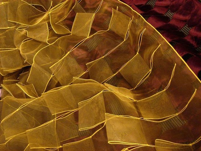 Pri dizajnovaní týchto látok sa pracuje aj s ďalšou formou spracovania, a tou je vyrezávanie rôznych geometrických tvarov do látky, resp. ich následné prišívanie, čo je síce veľmi komplikovaná technológia, ale efekt stojí naozaj za to. Lom svetla na takejto látke a zároveň 3D-efekt je v tomto prípade vždy iný, a tým aj jedinečný. Tak ako sa teda snažíme pekne obliekať svoje telo, to isté by sme mali dopriať aj nášmu interiéru a „zaodieť ho peknou košeľou“. Či už je to priestor obývačky s decentným dekorom alebo spálne s viac opulentným… V byte, v hoteli, či v kajute. Alebo honosným a gracióznym dekorom v divadle.