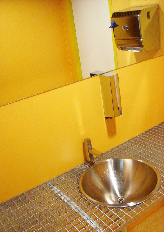 Architekt Alexy naozaj riešil zadanie komplexne a do detailu, nevynímajúc ani farebné riešenie. Takže priestory jedálne na prízemí sú žlté, čo príjemne oživuje sivé odtiene materiálov vo vstupe. Do toho sú na celoplošne liatej betónovej podlahe zakomponované farebné punkty z nábytku – stoličky s modrým čalúnením v kombinácii s bielym kancelárskym nábytkom – pracovnými stolmi a policami. Na druhom poschodí sídli vedenie firmy a ekonomické oddelenie, v menšej časti je „šéfovská“ zasadačka s kontrastnými červenými kreslami. Antracitová stena tu oddeľuje kancelársky priestor. Za ňou sú priestory sanity (tiež vo sviežom žltom odtieni) a „lahôdka“ v podobe pozinkovaného roštu – pultu, na ktorom je umývadlo. Aj to len potvrdzuje, že architekt dotiahol koncept do poslednej „matky“ na torte.