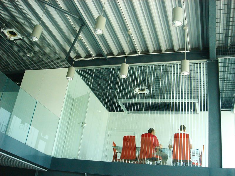 Vzhľadom na funkciu priemyselného objektu autor oceľovú „íčkovú“ konštrukciu priznáva, neskrýva ju, práve naopak – s precízne spracovanými detailmi (ako sú napríklad pozinkované oceľové matky v kontraste s tmavosivou antracitovou farbou konštrukcie) ju ešte viac zvýrazňuje, a tak dosahuje veľmi príjemný vizuálny efekt, ktorý dotvára ešte výplňovými materiálmi ako číre sklo, MDF-dosky, cetrisové platne alebo pozinkované rošty.