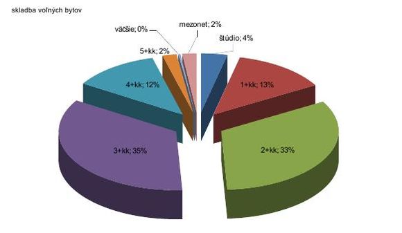 Dlho skoro nemenné číslo o počte voľných – ergo nepredaných bytov symbolizuje neadekvátnosť súčasnej ponuky. Napriek optimálnemu zameraniu na kategórie 2kk a 3kk, práve tieto tvoria ich podstatnú časť, pretože sú vďaka nadmernej výmere a nevhodným dispozíciám neatraktívne, no drahé, a tým pádom ťažko predateľné (čo dokumentuje aj kruhový graf o skladbe voľných bytov). Nasledujúce tabuľkové údaje o veľkosti voľných dokončených bytov sú vlastne názorným vysvetlením tejto patovej situácie a tak trochu aj poučením do budúcnosti, že skromnosť na všetkých stranách nikdy nie je na škodu.