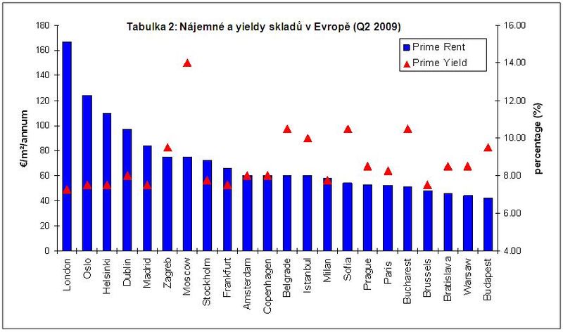 Navzdory určitým náznakům oživení na evropském trhu logistických a průmyslových nemovitostí, je poptávka po tomto typu prostor stále nižší než v loňském roce, což se odráží na stagnaci či poklesu nájemného. V průběhu druhého čtvrtletí 2009 kleslo nájemné nejvíce v Moskvě (25 %), Kodani o 22 %, v Dublinu o 16 % a v Sofii o 10 %. Stejná hodnota nájemného zůstala v Londýně (Heathrow), Bruselu, Paříži, Frankfurtu, Miláně a Madridu. Jediným městem, kde od začátku krize nájemné vůbec nekleslo, jsou Helsinky.