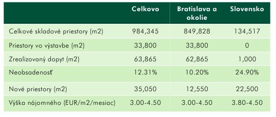 Na celkovom objeme skladových priestorov na Slovensku 984,345 m2 ku koncu 1. štvrťroku 2009 zaujme ich 84-percentný podiel v Bratislave a priľahlom okolí (849 828 m2), prevažne umiestnených popri diaľniciach D1 a D2. Mimo širšieho okolia metropoly ich je 134 517 m2. Spomalenie realizácie nových transakcií sa premietlo do zvýšenej miery neobsadenosti na 12,31% (medzikvartálny nárast o 2,1%).