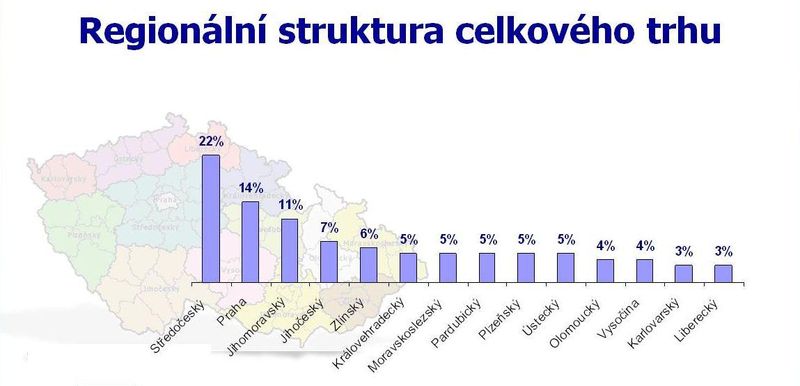 Nijak překvapivé výsledky naopak výzkum nepřinesl na poli teritoriálního rozložení realitních transakcí. Co do jejich objemu je jednoznačným rekordmanem trhu Středočeský kraj (22 %), následovaný Prahou (14 %) a krajem Jihomoravským (11 %). Na druhém konci tohoto žebříčku figurují Vysočina a kraj Karlovarský a Liberecký.