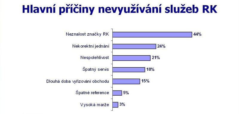 Z průzkumu Mindbridge, věnovanému právě této otázce, vyplynulo, že přes realitky u nás probíhá jen 54 % všech realitních transakcí. Potenciální zákazníci jsou přitom od využívání servisu realitních kanceláří odrazováni především nízkou orientací ve značkách RK, nekorektním jednáním, nespolehlivostí jejich pracovníků a špatným servisem. Naopak z průzkumu vyplývá, že cena služeb RK – podle Davida Krajného se v ČR standardně pohybuje mezi 3 – 5 % ceny obchodované nemovitosti – není pro poptávku nijak prohibitivním faktorem (pouhá 3 % respondentů vysvětlila nezájem o servis RK vysokou cenou jejich služeb).