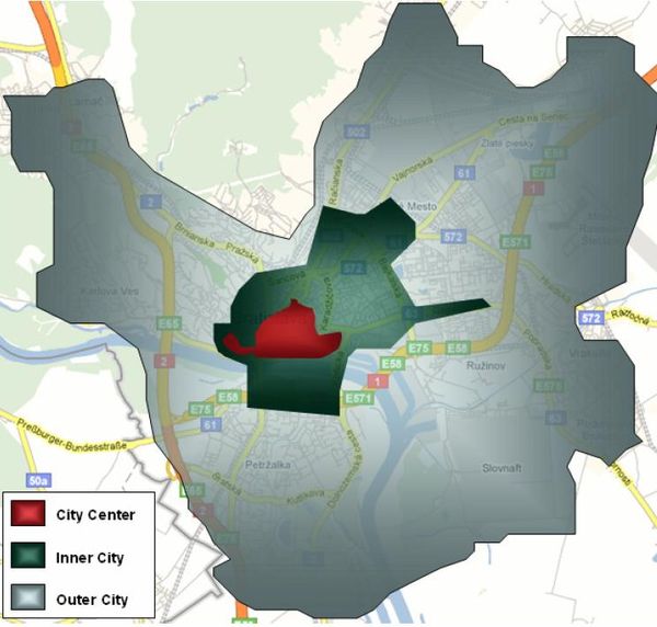 1 – Delenie administratívnej Bratislavy podľa BRF: City Center, Inner City,