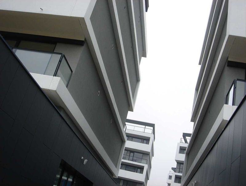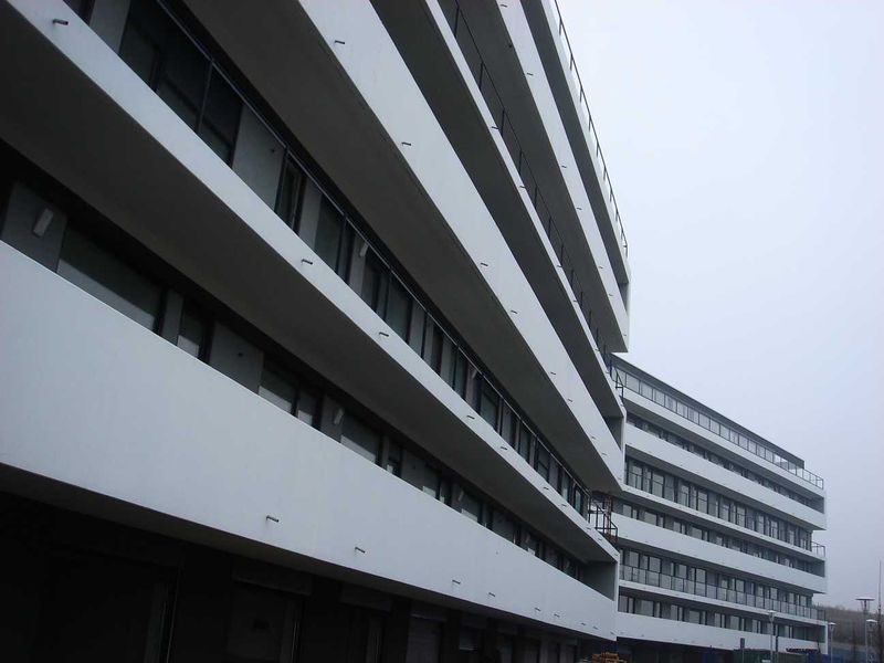 Tento jednoduchý raster potom prechádza aj do plných bočných fasád v podobe tenkých lemov. Strohý tvar a výraz betónových panelov je doplnený iba náterom bielou farbou. Konštrukčne sú panely prichytené o nosný skelet pomocou nerezových kotiev, dômyselne „skrytých“ v rámci zábradlia loggií. Zaujímavým prvkom figúry objektov je, že obe pozdĺžne fasády majú rovnaký výraz odlišujúci sa iba menšou presklenou plochou na severovýchodnej strane.