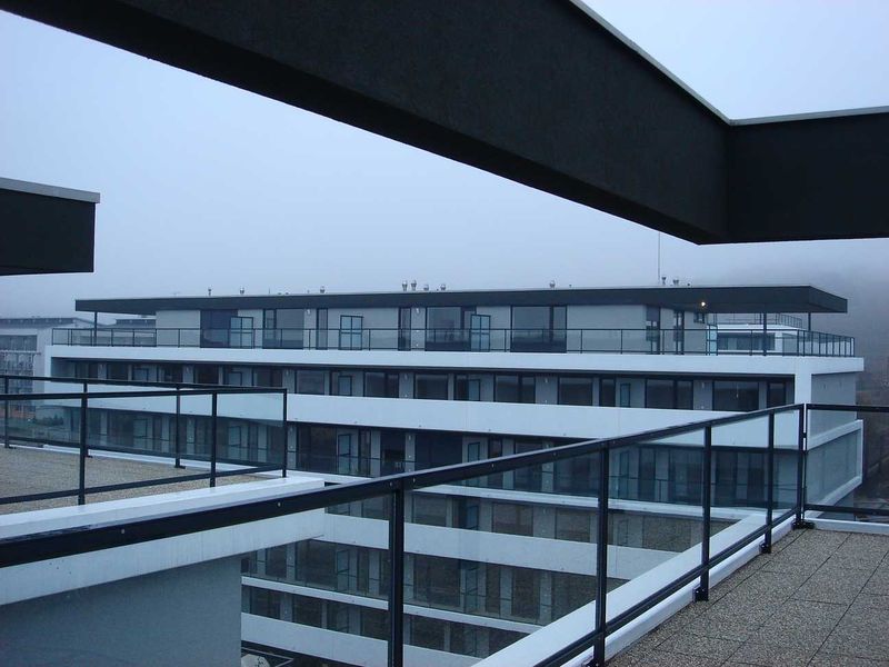 (presklené steny) na oboch pozdĺžnych fasádach, tak ako aj loggie.