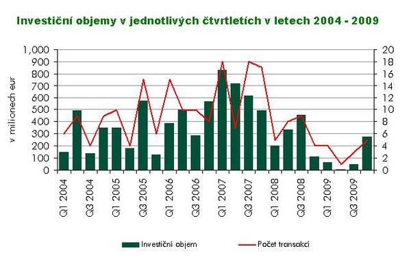 Nevalná loňská bilance investic na českém realitním trhu nicméně dostává poněkud veselejší či optimističtější charakter při pohledu na investiční aktivitu v jednotlivých čtvrtletích roku 2009. Na to upozorňuje právě už zmíněná studie CBRE. Na časové ose minulého roku je totiž patrné zpomalování poklesu investiční aktivity, nebo lépe řečeno – je zřetelné její narůstání jak co do počtu transakcí, tak také jejich objemu. První dvě čtvrtletí vykázaly nejnižší investice, což bylo ovlivněno nejistotou ohledně vývoje výnosů (prime yield) a celkové budoucnosti investičního trhu v České republice i ve světě. Ve druhé polovině roku 2009 začaly statistiky vypadat lépe, a to díky několika významným transakcím, které byly uzavřeny takřka v samém závěru roku. V posledním čtvrtletí 2009 domácí i zahraniční subjekty do nákupu českých nemovitostí investovaly částku 280 mil. eur v pěti transakcích. To představuje 80 % čtvrtletního průměru za uplynulých šest let – což na krizové časy je výsledek přinejmenším povzbuzující.