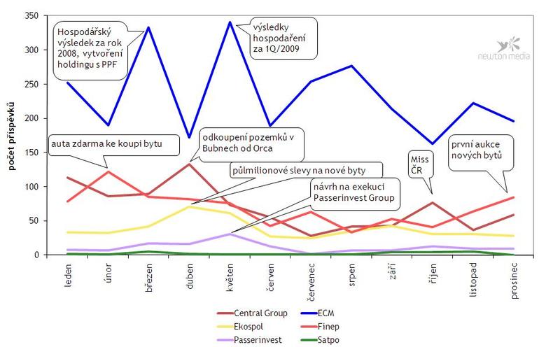 - Graf znázorňuje vývoj medializaci vybraných developerských společností v jednotlivých měsících roku 2009. V grafu jsou vyznačeny události, jež nejvýrazněji ovlivnily publicitu těchto společností.