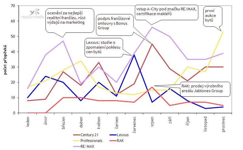 - Graf znázorňuje vývoj medializace vybraných realitních společností v jednotlivých měsících roku 2009. V grafu jsou vyznačeny události, jež nejvýrazněji ovlivnily publicitu těchto společností.