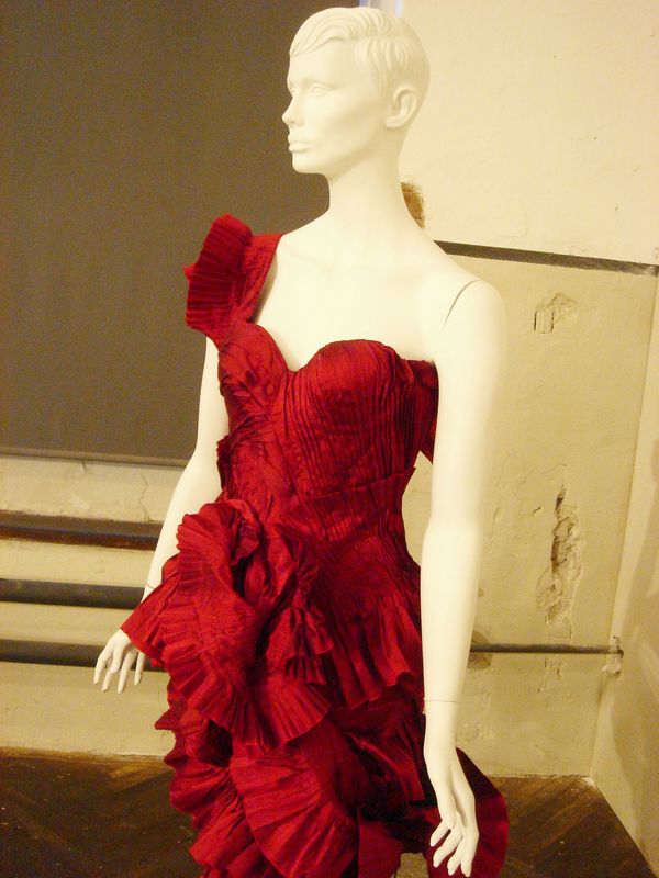 nazberaného a plisovaného červeného saténu. Tvarom i materiálom mu vo