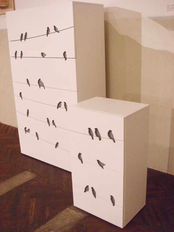 Nábytkové kúsky absolútne jednoduchých a minimalistických tvarov, ale s výrazným prírodným akcentom – časti konárov slúžia ako stojany lámp alebo ako držiaky predmetov na písacom stole – navrhla zo svetlého javorového masívu Veronika Szabóová. V tomto smere abstrahovania zašli ešte ďalej Marián Laššák a Pavol Capík pri svojich návrhoch stoličiek Stará mama a Popa vychádzajúc z absolútne pôvodných ornamentálnych remeselných tvarov stoličiek starých mám. Efekt je naozaj maximálny a čistý. A čo prebudí k životu takú tvarovo klasickú šuplíkovú skriňu alebo komodu? Jednoduchým motívom vtáčikov sediacich na drôte to dosiahla Jana Nováková – ešte študentka na Fakulte umení Technickej univerzity v Košiciach. Tieto tak výrazovo delia jednotlivé šuplíky.