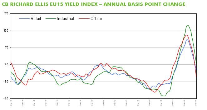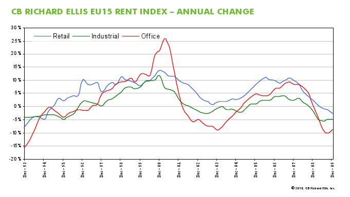 Rozdiely v medziročnom porovnaní výnosov (v bázických bodoch) a nájomného (v percentách) za maloobchodné, priemyselné a kancelárske nehnuteľnosti sú takmer nepatrné (pozri grafy). Ceny vo štvrtom kvartáli minulého roka vzrástli takmer v celej Európe. Skutočnosť, že sa to týka najmä kancelárskych priestorov, je pozoruhodná predovšetkým preto, lebo v tomto sektore bol zároveň zaznamenaný najväčší pokles nájomného. Takisto výnosy v sektore kancelárskych nehnuteľností klesli vo štvrtom kvartáli minulého roka na väčšine trhov, v retailovom sektore sa pokles týkal 11 z 39 analyzovaných trhov (z toho 8 bolo vo Francúzsku a Veľkej Británii).