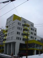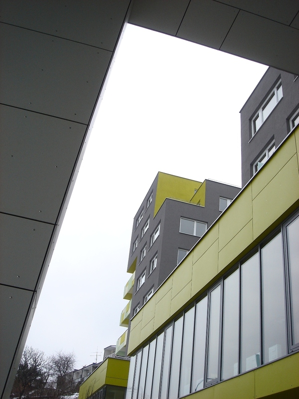 farebne definované jednak vybratia hmoty na posledných dvoch podlažiach