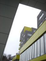 Aj keď využívanie svahovitých pozemkov na výstavbu nie je u nás kvôli vysokým stavebným nákladom na zemné práce a zakladanie objektu až také časté, vyskytnú sa aj svetlé príklady spolupráce investora a architekta, ktoré výnimky z tohto pravidla len potvrdzujú. Na celkovej ploche pozemku 4 429 m2 architekti zastavali 2 570 m2 a v dvoch takmer identických hmotách s vybavenostnou podnožou, rozdelených vertikálne prístupovými exteriérovými schodmi, dosiahli celkovú úžitkovú plochu 10 870 m2 na šiestich resp. ôsmich nadzemných podlažiach s obostavaným objemom 32 000 m3, pričom dve sú zapustené do svahu a využívajú sa ako garáže.