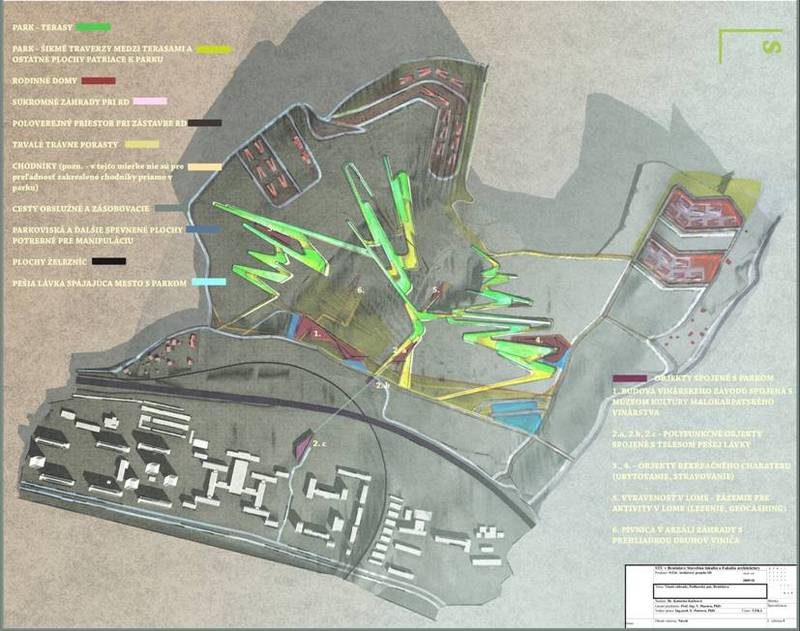 Jedným z 24 prezentovaných študentských projektov je aj jeden s príznačným názvom Bratislavský vinohradnícky park. Autori Bc. Silvia Rudincová a Bc. Július Škopp tak primárne navrhli spojenie pôvodnej a niekde aj bývalej vinohradníckej oblasti (nad Mladou Gardou) s mestom. Toto prepojenie je z hľadiska komunikácií jednak pešie a jednak dopravné. Funkčne sa prepojila táto oblasť s mestom najmä zrevitalizovaným a dnes už nevyužívaným Rösslerovým lomom, navrhnutým ako open space – otvorená galéria, kde sú v blízkosti aj lineárne objekty s otvorenou pasážou.