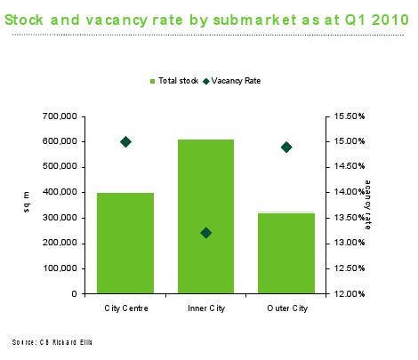 Miera neobsadenosti kancelárskych priestorov (Vacancy rate), čiže percentuálne vyjadrenie voľných prenajímateľných m2 v pomere k ich celkovej ponuke, mala zasa obrátený rebríček: negatívne prvenstvo získalo Outer City (15,5 %), po ňom City Centre (14,7 %) a nakoniec Inner City (13,7 %).
