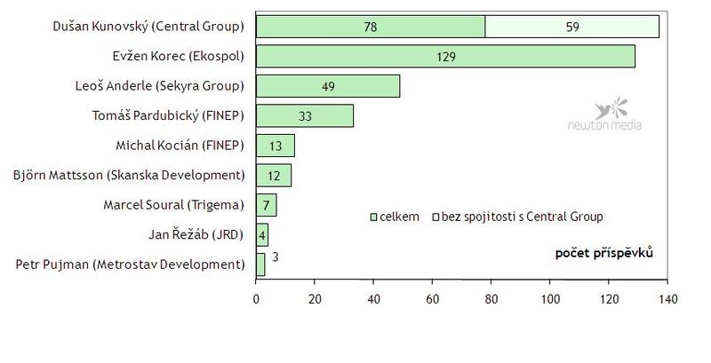 Graf zachycuje medializaci představitelů developerských firem v období od 1.1.2010 do 25.5.2010. U Dušana Kunovského jsou odlišeny příspěvky, v nichž figuroval bez uvedení příslušnosti k Central Group. Tyto příspěvky již do dalších částí analýzy nebyly zahrnuty.