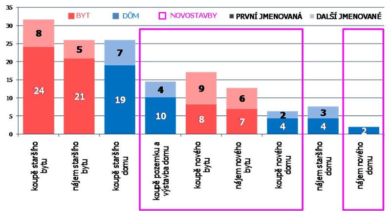 Od minulého šetření (proběhlo v roce 2008) přitom vzrostl zájem o starší byty. Rozhodující objem rezidenčních transakcí se tak i v příštích letech bude týkat starších nemovitostí, do kterých míří více než dvě třetiny zájemců o stěhování (45 % do staršího bytu, 23 % do staršího rodinného domu). Přitom mírně převažuje zájem o bydlení v bytě, jen dvě pětiny cílové skupiny preferují rodinný dům (ve finále ovšem někteří z nich z cenových důvodů skončí v bytě). Koupě nového bytu dnes zajímá jen 17 % cílové skupiny, přičemž v Praze je tento podíl vyšší než v regionech. Více než třetina lidí naopak počítá s nájemním bydlením – patrný je přitom nárůst zájmu o pronájem nových bytů.