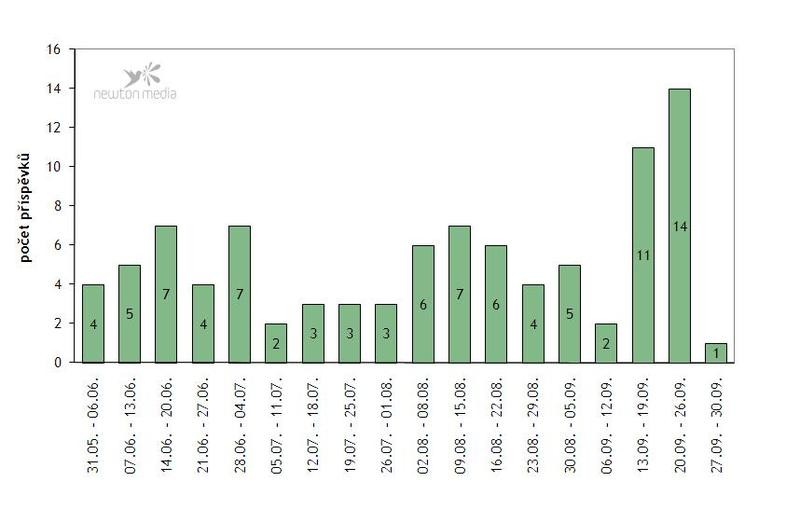 Nejvíce příspěvků, celkem 30, uveřejnila o nízkoenergetických stavbách MF Dnes. Největší zájem projevovala média o téma v září, za čímž stála rozmanitá paleta námětů.