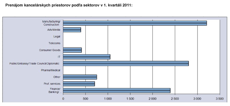 Pokiaľ ide o štruktúru spoločností podieľajúcich sa na uvedených transakciách, v uplynulom kvartáli sa prvýkrát narušil dlhoročný trend dominancie IT firiem, pričom výrazne zosilnel podiel odvetvia výroby resp. stavebníctva (3 200 m2), verejného sektora a zastupiteľských úradov (2 800 m2), nasledované finančným sektorom a bankovníctvom (2 400 m2).