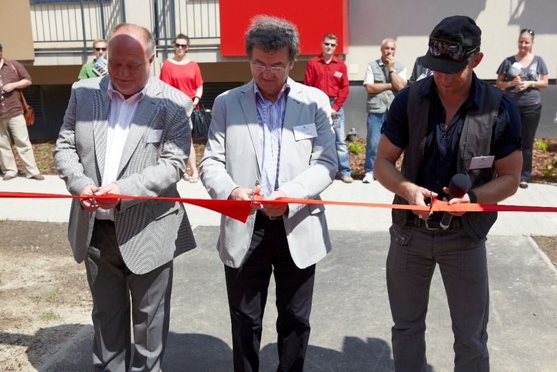komplexom a slávnostné prestrihávanie pásky. (Zľava) Kmotor projektu, herec