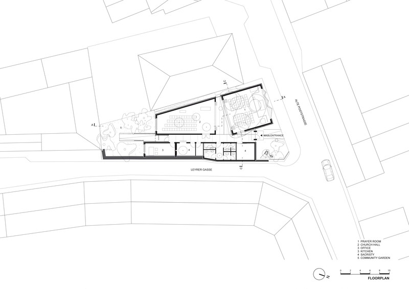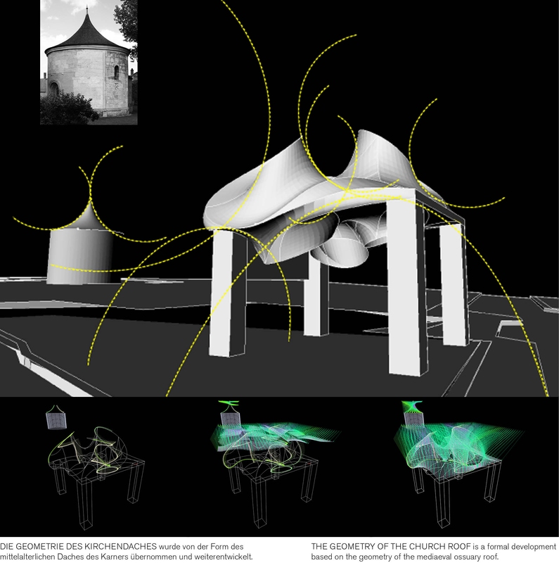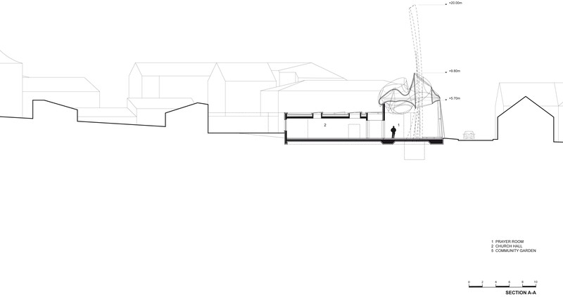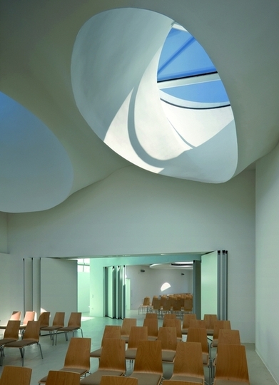 Architekti přiznávají inspiraci Le Corbusierovým klášterem La Tourette. Stejně jako u ostatních projektů COOP HIMMELB(L)AU probíhala výroba střešních prvků budovy kostela v loděnici, neboť specifické technologie zpracování kovů a složité tvarování pláště zvládají výrobci lodí nejlépe.