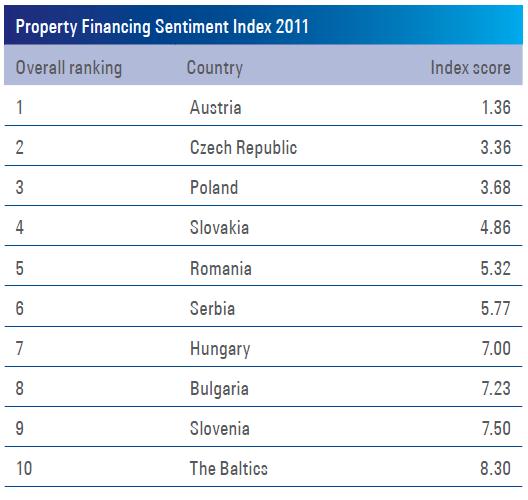 Aby zviditeľnila postoj bánk k financovaniu realitných projektov v každej z krajín, ktoré sa na prieskume zúčastnili, na záver prieskumu pripravila Index sentimentu financovania nehnuteľností (Property Financing Sentiment Index – pozri tabuľku). Vypočítala ho na základe odpovedí na 10 otázok z prieskumu. Ako je z výsledkov zrejmé, tesne za vedúcim Rakúskom sa umiestnilo Česko a Poľsko. Podľa KPMG to znamená, že v týchto štátoch sú banky projektovému financovaniu relatívne najviac otvorené.