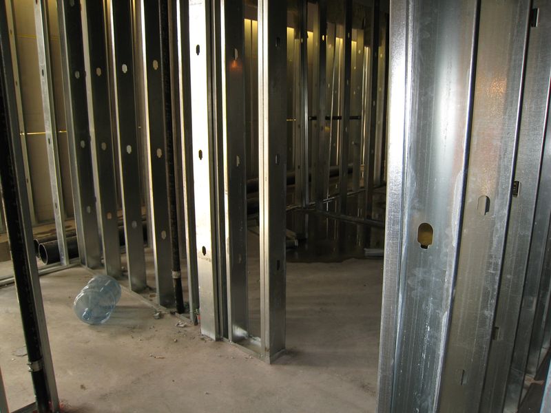 dřevěný dům ze svislých dřevěných fošen zvaných „studs“. Dělníci