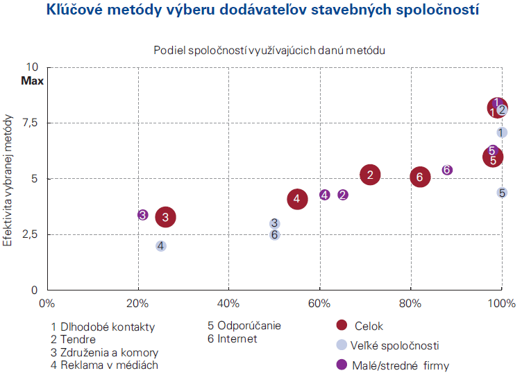Výskum CEEC Research a KPMG Slovensko, ktorý používa metódu dvojrozmernej segmentácie vzorky (veľkosť zúčastnených spoločností + ich stavebné zameranie), zároveň preukázal, že najmenej dôležitým kritériom pre výber dodávateľskej firmy je jej veľkosť. Pri vyjednávaní podmienok majú však viacej úspechov veľké stavebné spoločnosti: ceny ich dodávateľov klesli o štvrtinu.