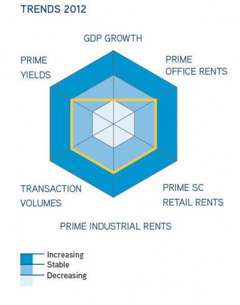 12 new office buildings were completed during 2011, totalling almost 100,000 sq m; increasing office stock in Prague to 2.8 million sq m. 13 projects, totalling 127,400 sq m of new office development were under construction in 2011, most of which should be completed by the end of 2012. 2011 was a record year for gross office take-up, and prime rents remained unchanged. In 2012, 11 buildings, representing 113,000 sq m of office space, are expected to come on to the market, 65% of which will be located in Prague 4 and Prague 8. 2012 take-up levels are unlikely to reach the demand levels of 2011 and it is expected that share of renegotiated leases will increase as tenants reconsider expansion or relocation. Levels of speculative development are expected to drop in 2012 due to banking restrictions on development financing. Office rental rates are anticipated to remain flat throughout 2012; however, net effective rents could rise from their current levels of 10–15% below quoted headline rents as vacant space around Prague dries up.