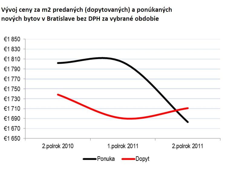 A vzápätí pridáva konkrétne čísla. Priemerná cena bytov predaných počas 2. polroka 2011 bola 1,711 € za m2, zatiaľ čo priemerná cena bytov v ponuke klesla na 1,683 € za m2 (oboje bez DPH). „Prvýkrát v našom prieskume je cena za štvorcový meter predaných nových bytov vyššia ako tých bytov, ktoré sú v ponuke v hlavnom meste, pričom nejde o jednorazovú anomáliu, keďže tieto hodnoty sa k sebe s občasnými odchýlkami približovali,“ interpretuje kurióznu situáciu, ktorá vznikla v Bratislave, vedúci rezidenčného oddelenia Jones Lang LaSalle na Slovensku Michal Padych.