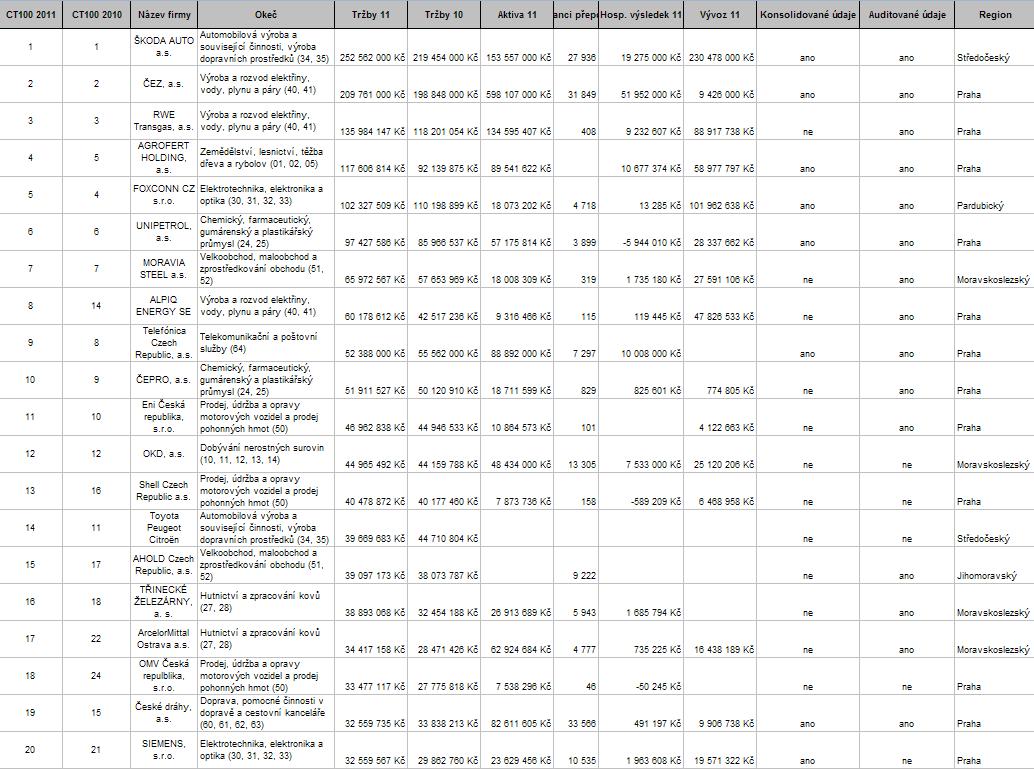 „Vítězem“ podnikové TOP-100 je už tradičně Škoda Auto s tržbami ve