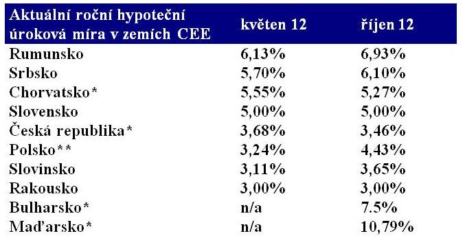 Aktuální úroveň úročení tuzemských hypoték se jeví jako velmi výhodná i v rámci regionálního srovnání. To provedla poradenská společnost TPA Horwath v květnu a říjnu tohoto roku, když v průzkumu porovnala hypoteční sazby v zemích střední a východní Evropy (v České republice, Rakousku, Slovensku, Polsku, Slovinsku, Chorvatsku, Srbsku, Rumunsku, Bulharsku a Maďarsku).