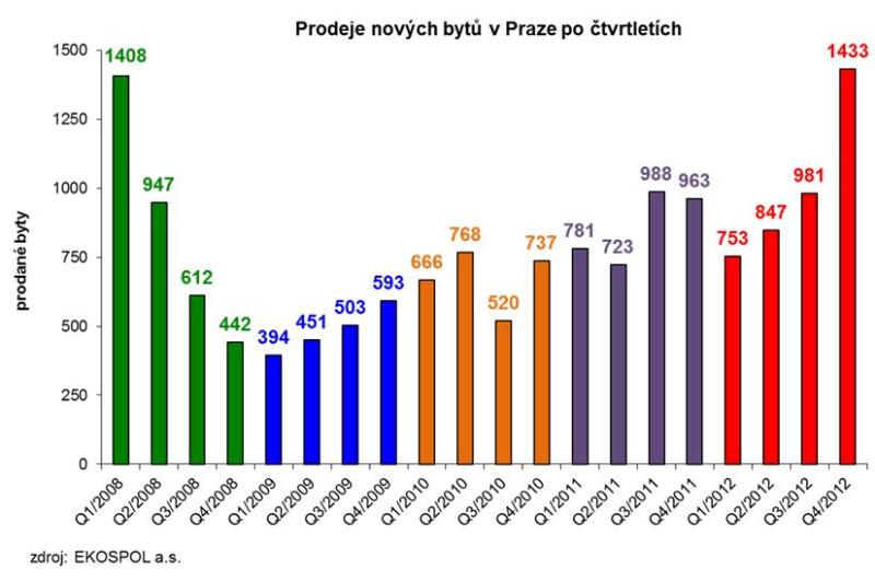 Další graf – prodejů po čtvrtletích – naznačuje, že za slušnými výsledky loňského roku stál především jeho závěr. Prodeje ve čtvrtém čtvrtletí loňského roku dokonce překonaly některá čtvrtletí ještě z dob realitního boomu. Za obrovským nárůstem prodejů v posledním kvartále stály hlavně superlevné byty v projektech na Praze 10, která se na celkových prodejích podílela skoro z jedné třetiny. V rámci tohoto městského obvodu pak jednoznačně nejprodávanější lokalitou byly Horní Měcholupy. „Ať se to někomu líbí, nebo ne, pokud se v jedné lokalitě nabídne zhruba sedm set nových bytů za ceny o 30 % nižší, než je pražský průměr, má to vliv na celý trh a poptávka se logicky stahuje do jediné lokality,“ vysvětluje Evžen Korec. Podle něj za výsledky roku 2012 stojí práce s cenou, vhodná nabídka a levné hypotéky. Specifický a podstatný vliv pak podle E. Korce měly investiční nákupy, ke kterým docházelo především u těch nejlevnějších projektů. V obavě z budoucího vývoje ekonomiky, inflace a z nejistoty ohledně budoucnosti penzijního systému totiž začali Češi investovat do nemovitostí jako prostředku uchování hodnoty a zabezpečení na stáří. Soudě dle ekonomických prognóz pro příští rok, bude tento trend pokračovat.