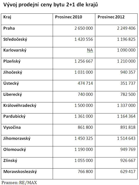Pokud se porovnají jednotlivé kraje, pak největší pokles cen bytů o zmíněných parametrech zaznamenala Praha, a to až 400 000 Kč na bytovou jednotku. V procentním vyjádření ale pokles cen v Praze není tak výrazný, oproti celorepublikovému průměru jde o pouhých 5 % . Zajímavá situace nastala v Jihomoravském kraji a na Vysočině, kde ceny neklesaly. A za zmínku stojí i značný rozptyl absolutních cen, zvláště v porovnání atraktivních lokalit. Pomineme-li Prahu, pak relativně vysoké ceny vykazují Středočeský či Královéhradecký a Jihomoravský kraj, zatímco hlavně v Ústeckém kraji se stejné byty kupují za ceny skutečně výhodné, v porovnání s Prahou představují ani ne 20 %.