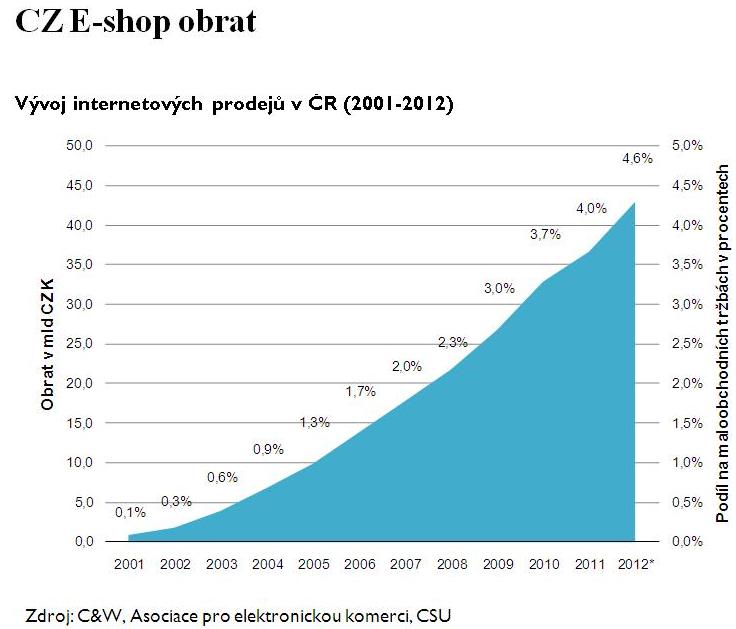 Naši internetoví prodejci dosáhli v roce 2012 stejného obratu jako 46 průměrných „kamenných“ obchodních center. Přes internet se u nás loni prodalo zboží za 43 miliard korun. Z analýzy, kterou zpracovala poradenská společnost Cushman & Wakefield na základě vlastního šetření, údajů Asociace pro elektronickou komerci a z dat Českého statistického úřadu, přitom vyplývá, že posuny v této oblasti jsou značné, ale nikoli tak revoluční, jak se občas prezentuje – za uplynulých deset let se objem internetového prodeje sice mnoha násobně zvýšil, ale celkově na něj připadá stále jen 5 % domácího maloobchodního obratu.