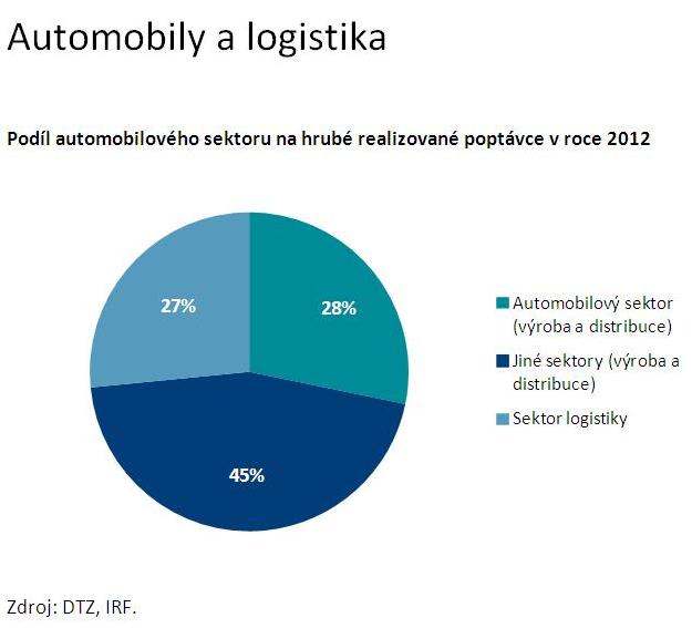 Celkem bylo na konci minulého roku ve výstavbě 196 000 metrů čtverečních skladových a průmyslových areálů, z toho bylo na konci 4. čtvrtletí předpronajato zhruba 92 %. A na začátek výstavby čeká dalších 120 000 „čtverců“ s plánovaným dokončením v roce 2013. Společnosti z automobilového průmyslu v loňském roce měly výrazný podíl (28 %) na hrubé i čisté realizované poptávce – realizovaly nové nájemní smlouvy v celkovém objemu 177 800 metrů čtverečních, což představovalo 31% podíl na čisté realizované poptávce v roce 2012. To podle analýzy DTZ souvisí s přesunem výrobních kapacit některých společností ze západní Evropy do střední Evropy či rozšířením již stávajících provozů (u nás to byl např. smlouvy pro firmu Faurecia či SAS Autosystemtechnik).