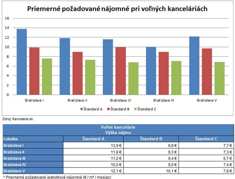 Priemerná požadovaná výška priemerného čistého nájmu (average asking rent) voľných kancelárií štandardu A, B, C v Bratislave za 1. kvartál 2013 dosiahla v jednotlivých mestských častiach nasledovné hodnoty: