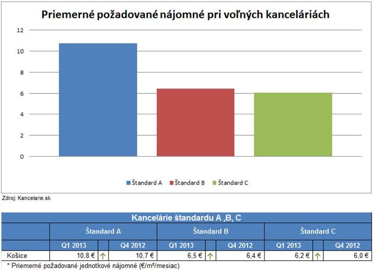 Košice: Výška nájmu voľných kancelárskych priestorov Požadovaná výška priemerného čistého nájmu (average asking rent) voľných kancelárií štandardu A, B, C v Košiciach v 1. kvartáli 2013 dosiahla nasledovné hodnoty: