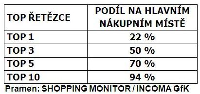 Těchto pět nejsilnějších obchodních řetězců preferuje jako hlavní nákupní místo téměř přesně 70 % českých domácností, přičemž na první tři nejsilnější připadá 50 % českých, moravských a slezských domácností.