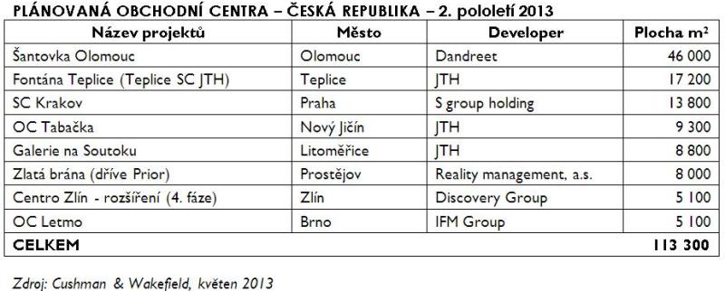 „V České republice stále rostou nová obchodní centra, i když jiného typu než v minulosti. Trend modernizace a rozšiřování úspěšných projektů je viditelný také. Dá se říci, že jsme uprostřed cesty mezi rozvíjejícím se a dospělým trhem,“ říká Jan Kotrbáček z C&W ČR/SR a dodává: „Další centra jsou v plánu i pro další roky – například Quadrio v Praze nebo Central v Kladně. Jako příklad rozšiřování úspěšných center můžeme uvést IGY v Českých Budějovicích nebo OC Královo Pole v Brně.“