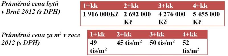 Průměrná cena za metr čtvereční bytových novostaveb je v Brně stále o čtvrtinu nižší než v Praze – loni činila 47 000 Kč, když letos stoupla na 55 000 Kč. Zároveň je ovšem třeba zmínit skutečnost, že přes stagnující ekonomiku a tendencím lidí šetřit je v Brně překvapivě vysoký zájem o luxusní byty s cenou šplhající nad čtyři miliony. Ty v moravské metropoli loni tvořily loni čtvrtinu všech nabízených nových bytů a prodávají se velmi rychle. Hlavní proud poptávky ale samozřejmě směřuje spíše k opačnému segmentu bytové výstavby.